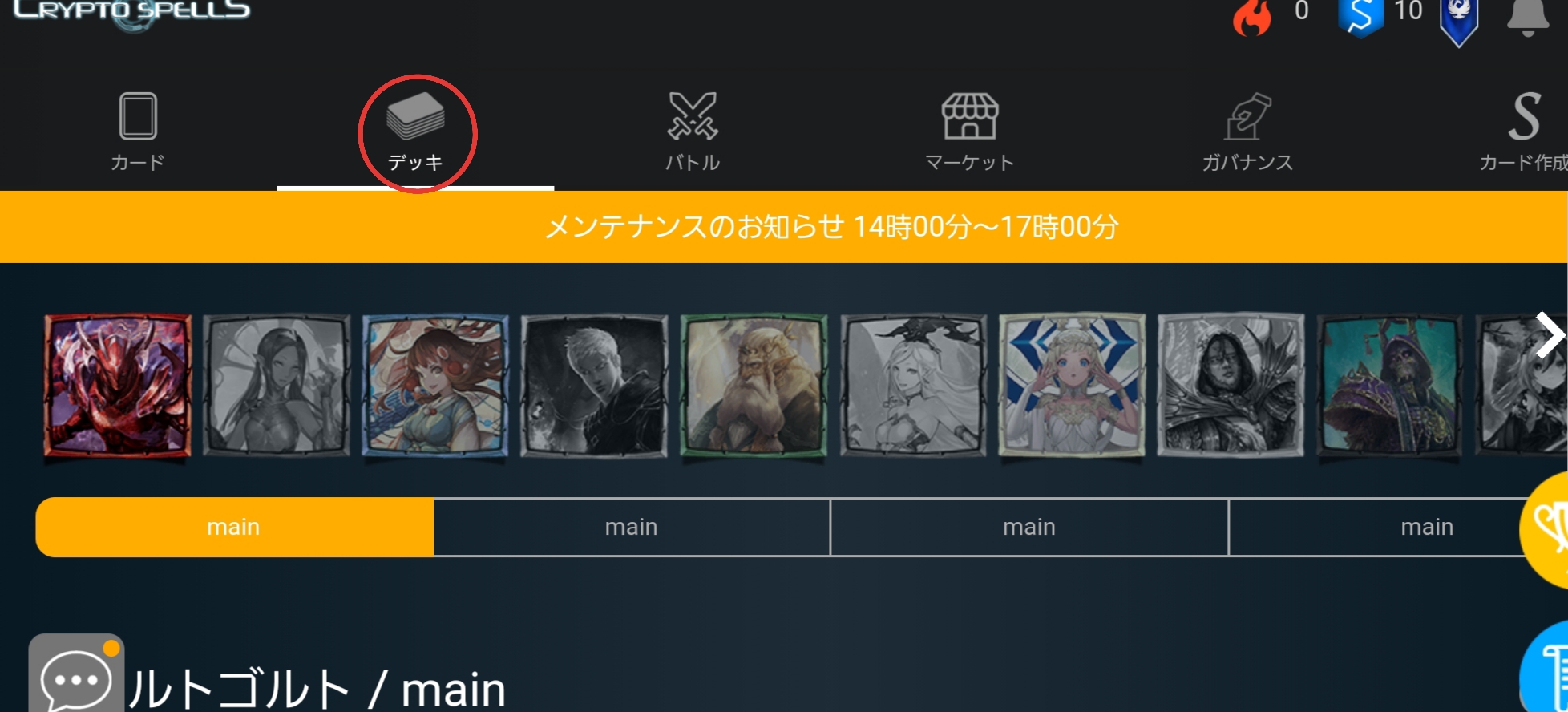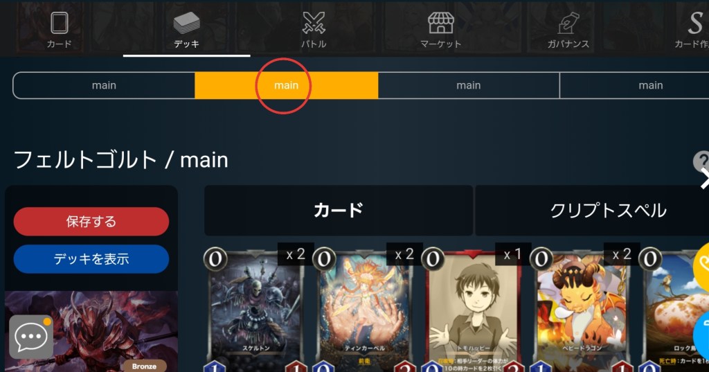 デフォルトのデッキからいらないカードを抜いて入れたいカードを入れるならそのまま編集できるんですが、今回は1からということで、メインを画像のように二番目をタップしてください!